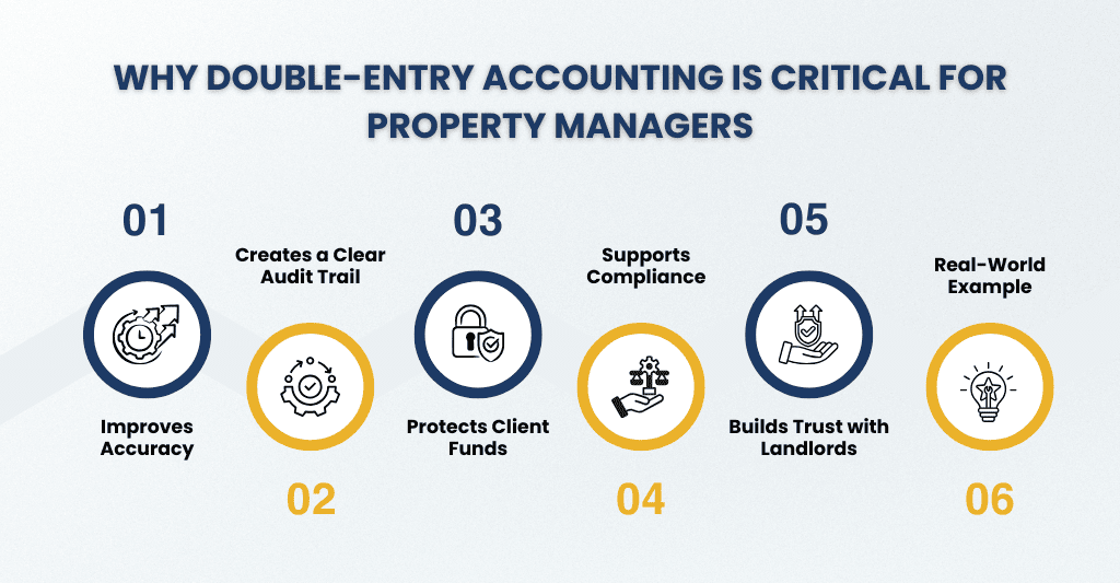 Real-world example: When rent is received, double-entry accounting is used to record the cash in the client account as well as the landlord’s liability. This avoids rent from being incorrectly classified as business income.